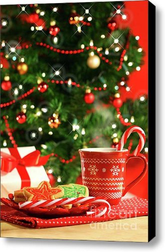 Christmas cookies near the tree Canvas Print / Canvas Art - Artist Sandra Cunningham - This is a beautiful stretched-canvas print wrapped on 1.5" thick stretcher bars. The print is professionally printed, assembled, and shipped within 2 - 3 business days from our production facility in North Carolina and arrives ready-to-hang on your wall. Fine Art America is home to more than 75,000 artists from all over the world who entrust us to fulfill their print orders online. We offer a 30-day money-back guarantee on every print that we sell and look forward to helping you select your next