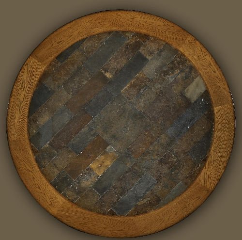 Red Rock Wood / Stone Pub Table - This 45" round wood pub table has a rustic charm featuring stone inlay top and sturdy black metal base.