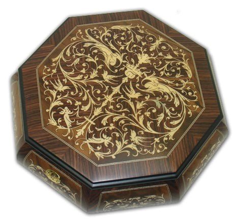 Two Layered Arabesque Octagonal Wooden Music Jewelry Box With 36 Note (O' Christmas tree - 1 Available) - This luxurious music box is the one that everyone wants. The arabesque inlay on top of the box is precision made by some of the best craftsmen in Sorrento, Italy. Perfect for any occasion, makes an immaculate collectors piece, and even a better gift. A classy and elegant item, this music box is sure to add pizzazz into any room in your home or office. Inside the box is lined with beige velvet, to create a luxurious space for any of your belongings. It also comes with a lock and key to keep your