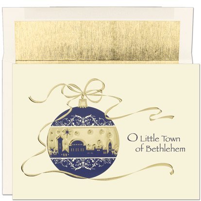 Bethlehem Ornament Boxed Holiday Cards 16 cards with 16 envelopes - Bring a smile to your friends and family this Holiday Season with our Holiday Collection Boxed Holiday Cards! Bethlehem Ornament Boxed Holiday Cards are made from a 10 Pt. Stock and are not printable. These Religious Themed Boxed Holiday Cards measure 5.625 X 7.875 each. Ivory-Gold Foil Lined Envelopes are included. Packed in a Box With Acetate Lid.Special Features: Gold FoilThese Holiday Cards feature a verse written in Navy. The verse reads 'As The World Rejoices In The Wonder Of His Birth, Ma