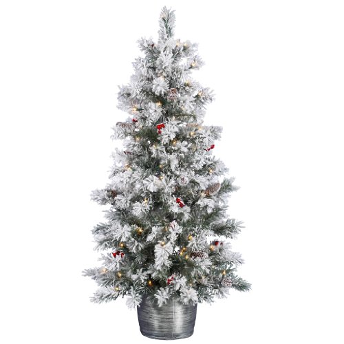 Vickerman 27758 - 4' x 28" Flocked Pine Berry 100 Clear Lights Christmas Tree (J123341) - 4' x 28" - Flocked Pine - 196 Tips - 100 Clear Miniature Lights - Plastic Pot | Vickerman Pre-Lit Christmas Tree with Snowy Berries