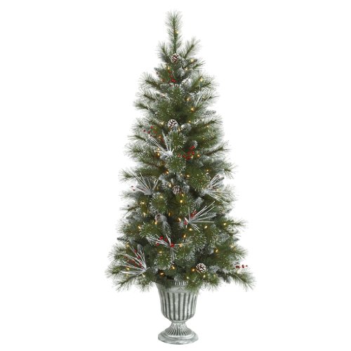 Vickerman White Glitter Tip Mix Pine Prelit Christmas Tree - With berries, pinecones, and red berries peeking out of the branches, the Vickerman White Glitter Tip Mix Pine Prelit Christmas Tree adds a festive and elegant look to your holiday decor. With frosted tips and an elegant urn, this beautiful tree looks stunning in any home or office. Specifications for White Glitter Tip Mix Pine Tree Shape: Medium Base Width: 32 inches Number of Bulbs: 150 Number of Tips: 318 Don't Forget to Fluff! Simply start at the top and work in a spiral motion down the tree