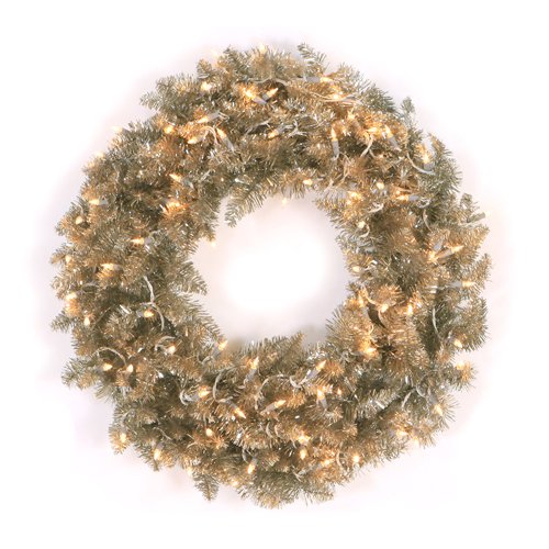 Item #K884361This winning pre-lit wreath is an exciting hard-to-find designer champagne color. This tree's unique needles feature a mixture of champagne and silver tinsel. The lights are also a designer color with matching champagne wire and clear bulbs.